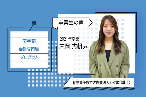 本学科を選んだ理由の一つは、専門学校との提携によりダブルスクールの費用負担がないことでした。経済的な不安がなく勉強に集中でき、専門学校の講義を本学で受講できるので時間を有効活用できました。また、公認会計士試験や日商簿記検定1級の試験などに合格すると単位に認定されるので、余った時間で留学などに挑戦することも可能です。何より、同じ夢を持つ仲間たちが集まるのでモチベーションを保つことができ、卒業後も情報共有しやすい環境があります。こうした独自のプログラムに加えて、さまざまなバックグラウンドや価値観を持った学友に触れることができる点が、本学科ならではの魅力だと思います。