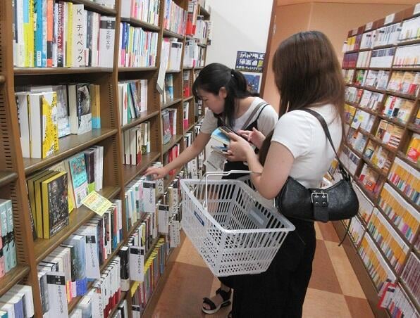 「学生選書ツアー」は、学生が書店に出向き、図書館に置きたい本を自ら選ぶ企画です。選ばれた本は選書理由を添えて図書館で紹介されることで、読書や図書館への関心を高めることを目的としています。