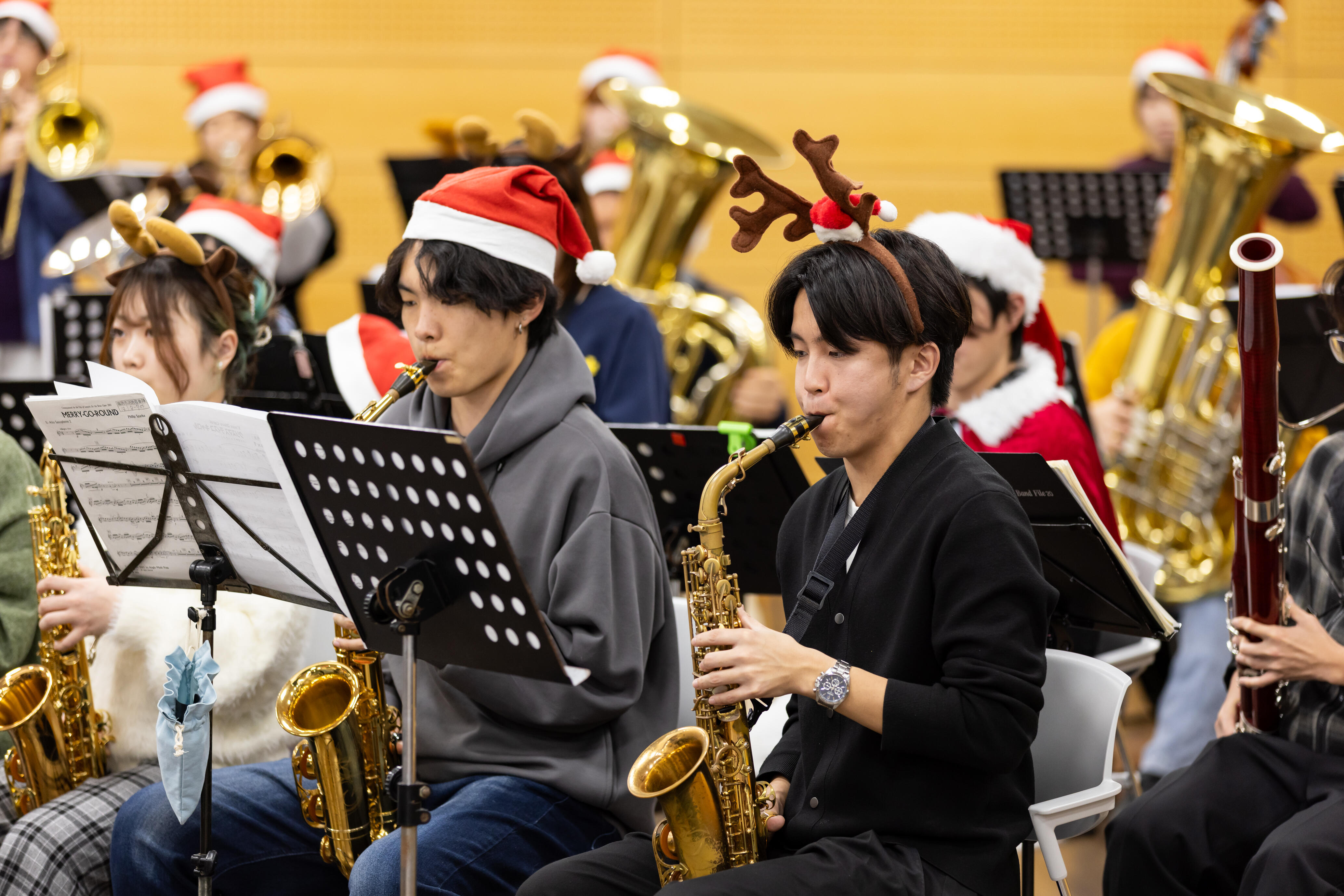 今、まさにクリスマスシーズン。応援指導部ブラスバンド部門とジャズ研究同好会に所属する学生たちが、心温まるクリスマスソングを演奏してくれました。