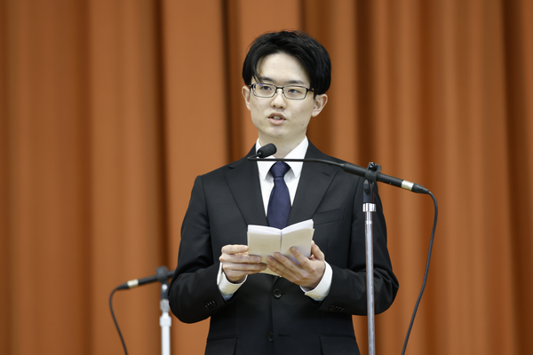 新入生総代の芥川玄成さん(医学部医学科)は、「歴史と伝統ある福岡大学で学べることは、大きな喜びであると同時に、大学生としての責任を感じ身の引き締まる思いがしています。AIの発展や国際社会が抱えるさまざまな課題を前に、私たちは社会の一員として何ができるのかを考え続け、学びを社会に生かしていきたいと考えています。これからの大学生活では、困難や失敗も経験するかもしれませんが、仲間と共に学び合い、主体的に挑戦を重ねながら成長し、福岡大学で得た学びを社会に役立てられるよう努めてまいります」と入学の辞を述べました。