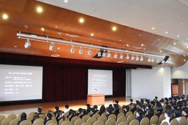 入寮式は、新入寮生に対して、指定寮の一員としての自覚を促すとともに、規律ある共同生活ヘの意識づけを行うことを目的としています。式では、築山泰典学生部長から「皆さんは、キャンパス内での学びに加え、一つ屋根の下で集団生活を送ることにより、先輩、後輩そして寮主さんとのコミュニケーションを通して、思いやりの心や協調性を培ってほしいと願っています。指定寮での生活を通して、大きく成長してください」とエールが送られました。また、寮生活における心構えや安全で安心な共同生活を送るためのルールについて説明されました。