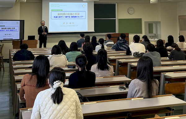 その一環として、11月5日(水)には、日本病院薬剤師会会長の武田泰生先生(本学薬学部 昭和57年卒)をお招きし、「薬剤師の軌跡と未来 -先輩と語ろう!薬学生・薬剤師のキャリア-」と題した講演会を開催しました。
