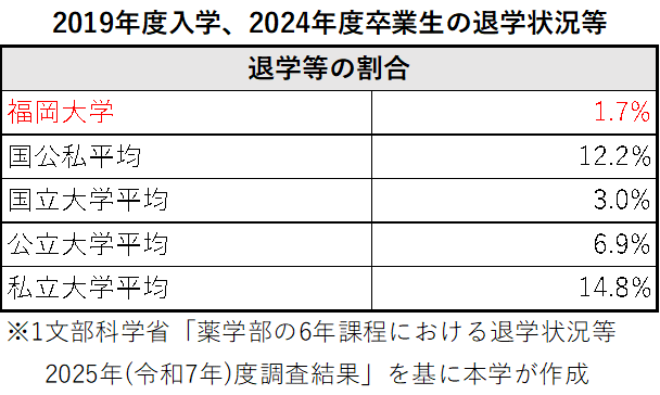10月31日(金)に文部科学省が公表した2025年度の『薬学部の6年制課程における退学状況等』(*1)によると、福岡大学薬学部の退学率は1.7%であり、全国に62校ある私立大学薬学部の中で、2年連続で最も低い退学率でした。