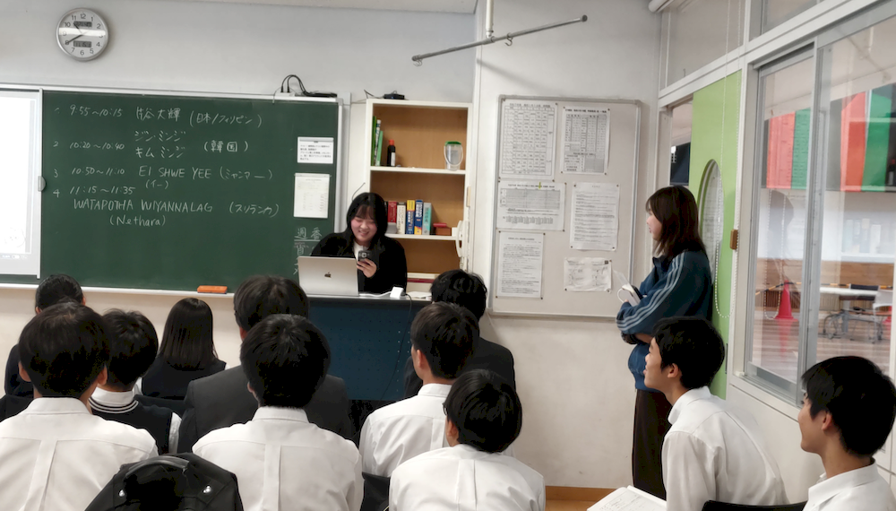 当日は、留学生が1年生の各教室でパワーポイントなどを用いて自国文化や特徴を説明しました。生徒からは多くの質問が寄せられ、文化や考え方の違いに刺激を受けながら、笑い声が響く場面もあり、和やかな雰囲気で交流が進みました。