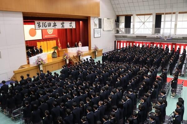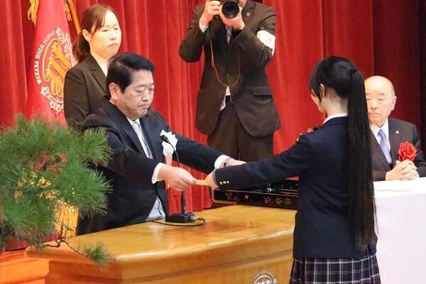 式典では宮原歩校長が、「506人の卒業生の皆さん、卒業おめでとうございます。ノーベル賞受賞者の坂口志文先生は”ひとつ、ひとつ”という言葉を大事にしています。やらなければならないことはいろいろある、しかし、いっぺんにはできない。一つ一つ解決すると、気づいたらちゃんと、いろいろなことがわかるようになるということです。これはすべての人に共通することで、これからの人生で出会ういろいろな課題や壁を”ひとつ、ひとつ”乗り越えてほしい」と言葉を贈りました。