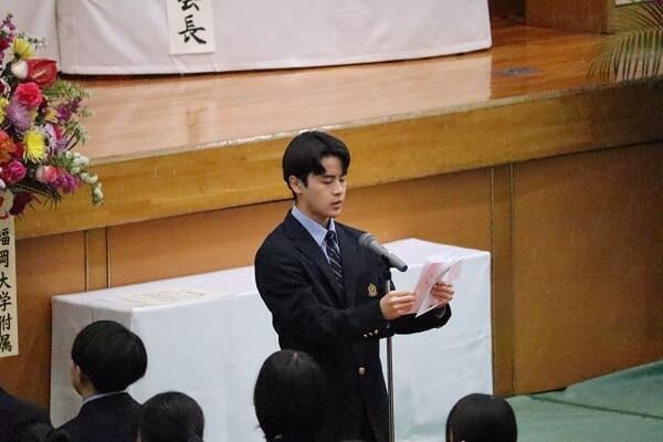 在校生を代表して、佐藤太陽さん(2年生)から「若葉高校で培った強さと優しさがあれば、きっとどんな壁も乗り越えられるはずです。場所が離れても、時が流れても、ここで過ごした三年間は、先輩方の心の中でこれからも輝き続けます」と送辞がありました。