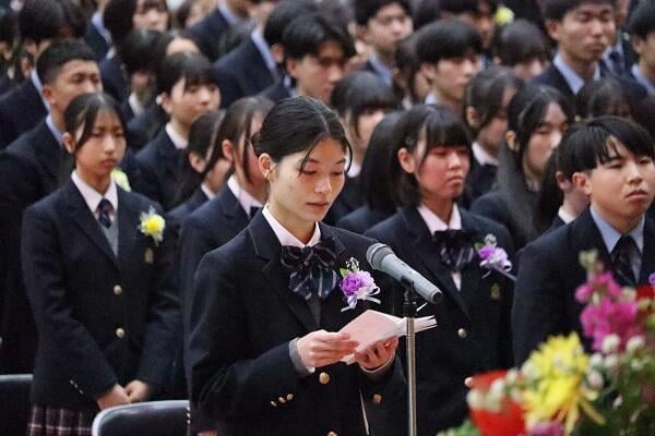 卒業生を代表して植田心晴さんから「若葉高校で出逢い、共に過ごした時間は、私たちにとって揺るぎない誇りです。これからそれぞれの道へ進んでも、ここで結ばれた想いと絆は決して消えることはありません。いつの日か、この場所で再び笑顔で集える日を、心から願っています」と、答辞がありました。