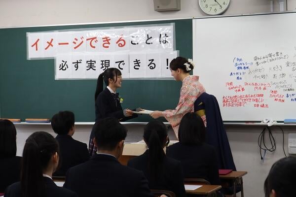 式典後、各クラスでは最後のホームルームが行われました。3年間の思い出が詰まった教室で、担任の先生からのエール、クラスメートとの別れを惜しむ生徒、飛躍を誓い合い時には涙を拭う生徒など、さまざまな姿がありました。