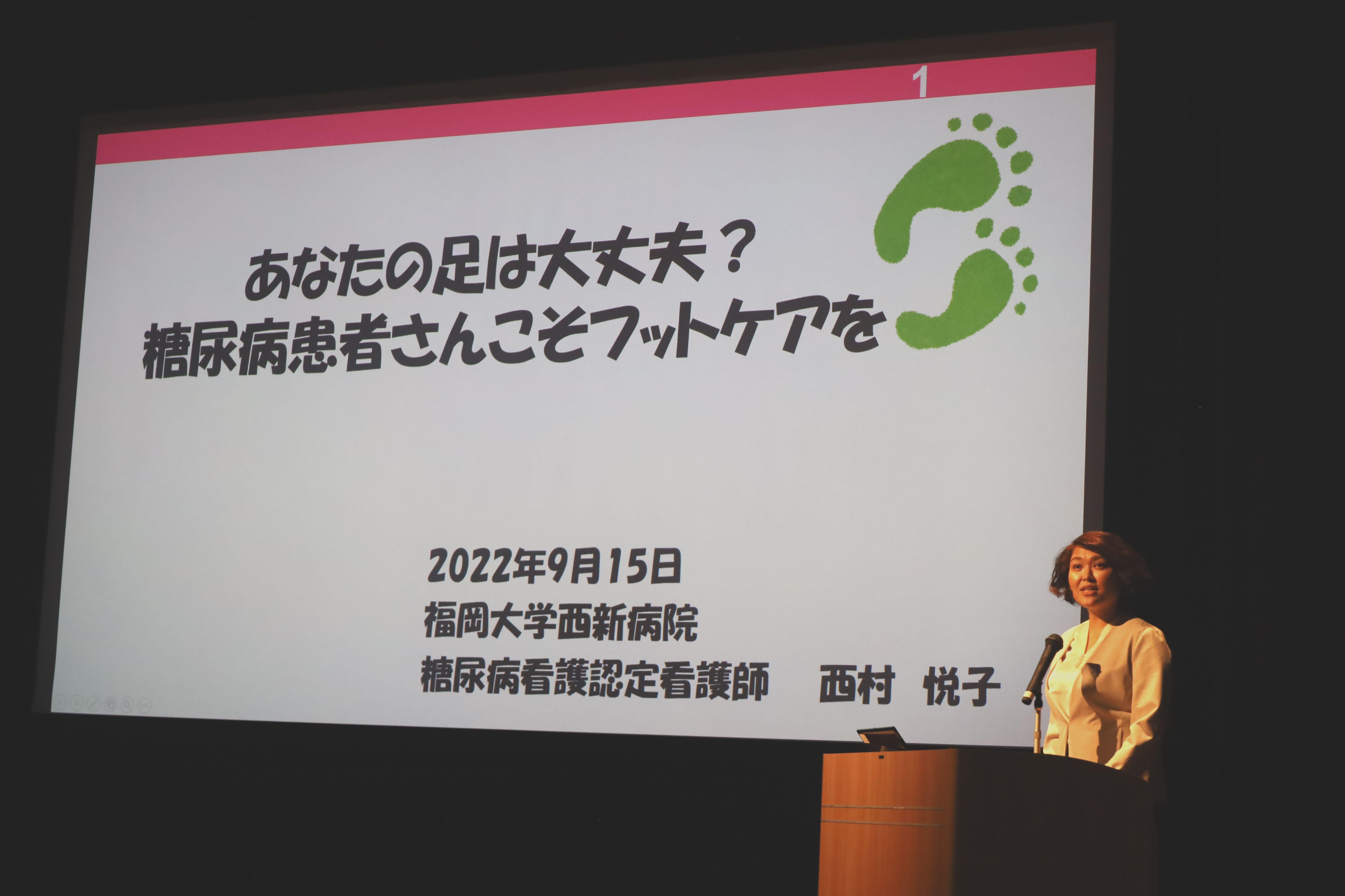 本セミナーは、福岡大学西新病院が地域貢献活動の一環として定期的に行っているもので、今回は、「糖尿病」をテーマに、福岡大学西新病院糖尿病・代謝・内分泌内科の福田高士医師、西村悦子糖尿病看護認定看護師、松﨑景子管理栄養士の3人の講師が糖尿病の概要や治療、家庭でできる予防などについて講演しました。