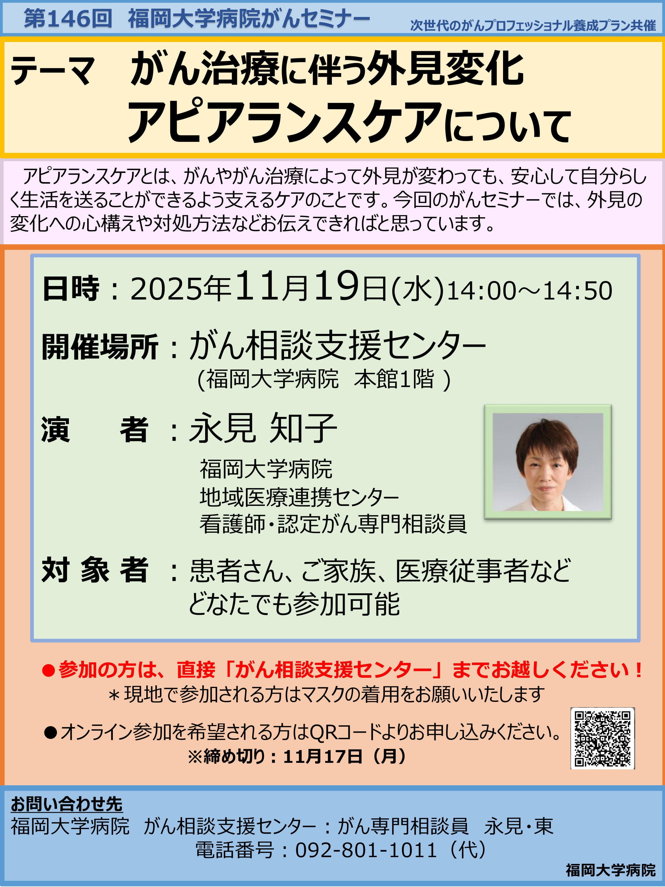 ※アピアランスケアとは、がんやがん治療によって外見が変わっても、安心して自分らしく生活を送ることができるよう支えるケアのことです。 - 演者:福岡大学病院地域医療連携センター 看護師・認定がん専門相談員 永見 知子