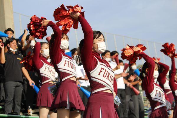 4月23日(日)には、春日球場(春日市)で西南学院大学との伝統の一戦「福西戦」が行われます(15時試合開始予定)。この試合では「応援合戦」が行われ、多くの学生、卒業生、教職員などが集うほか、応援指導部の応援団、チアリーダー、吹奏楽団、和太鼓部(鼓舞猿)が会場を盛り上げます。