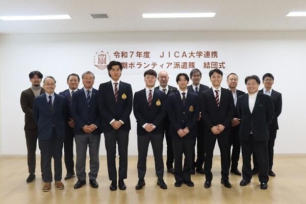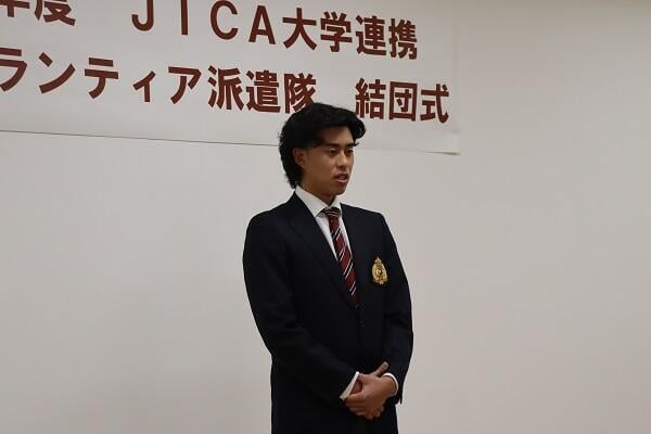 学生代表の緒方要さん(スポーツ科学部4年次生)が「現地の文化や価値観を尊重しながら、これまでの競技・指導経験を生かして子どもたちを指導します。また、日本の魅力や良さも積極的に伝えていきます」と決意表明しました。