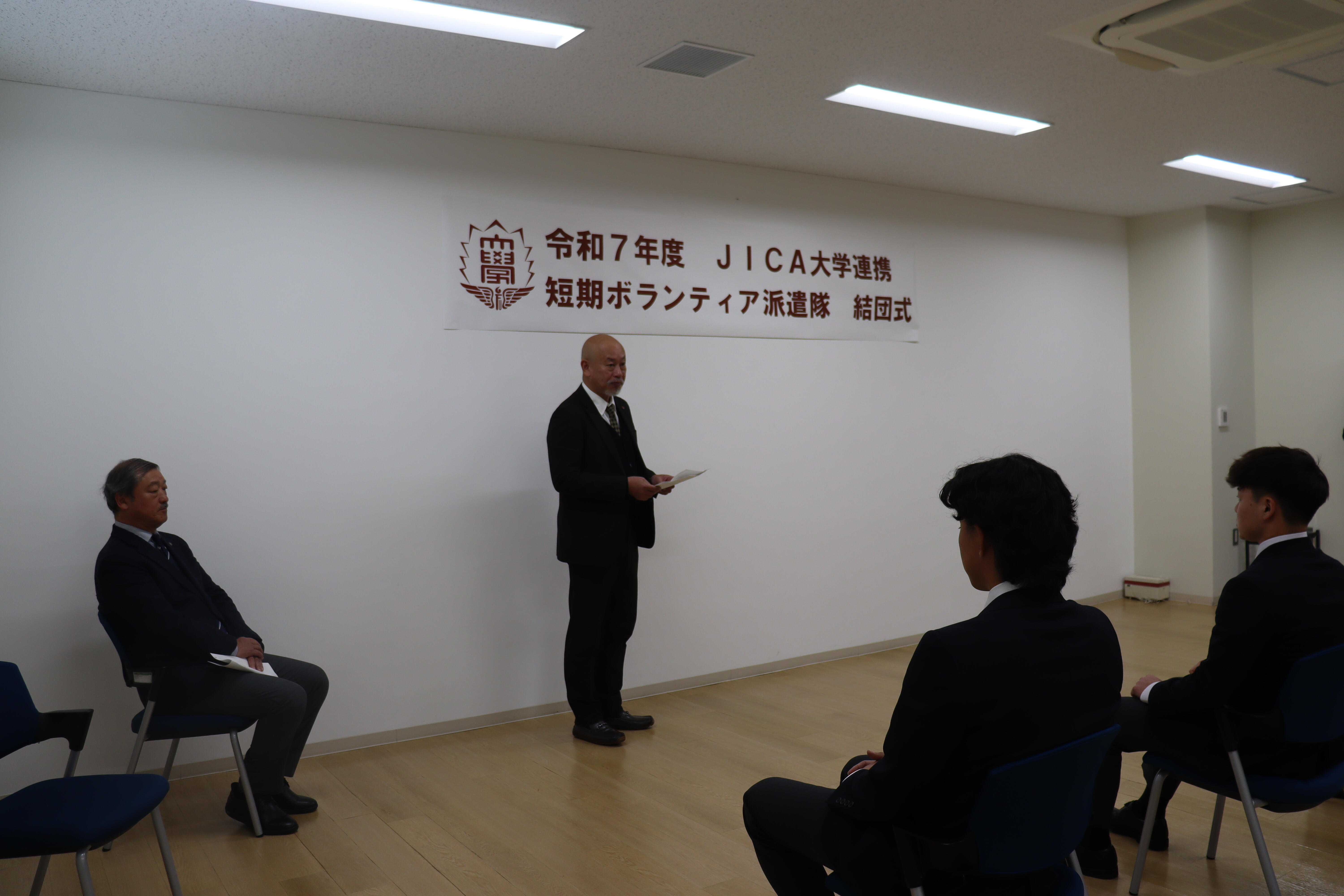 結団式では、築山泰典学生部長から「現地の文化や価値観に耳を傾け、そこから得られる学びを大切にしてください。異なる環境では戸惑うこともあるでしょうが、その経験こそが皆さんの成長につながります。どうか自信を持って堂々と挑み、健康と安全を第一に、実りある活動をしてきてください」とエールを送りました。