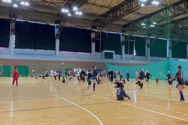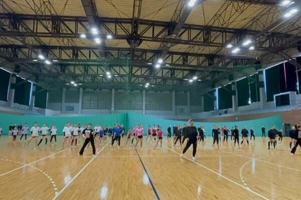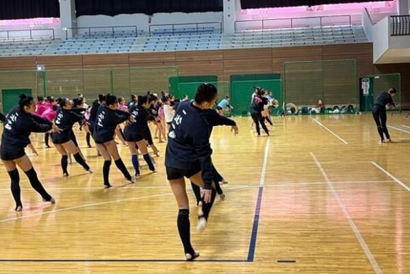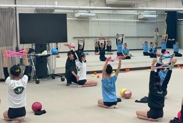 2日目は、元オリンピック選手の秋山エリカ先生による作品指導から始まり、今岡さんの美しい動きを手本に、参加者は表現力や身体の使い方を学びました。午後にはリボンやボールなど手具の基本練習、コンディショニングが続き、2日間を通じて新体操の基礎から表現まで幅広く学べる内容となりました。本学女子新体操競技部にとっても、講師陣から作品づくりの直接指導を受ける貴重な機会となり、表現の幅を広げる大きな学びとなりました。